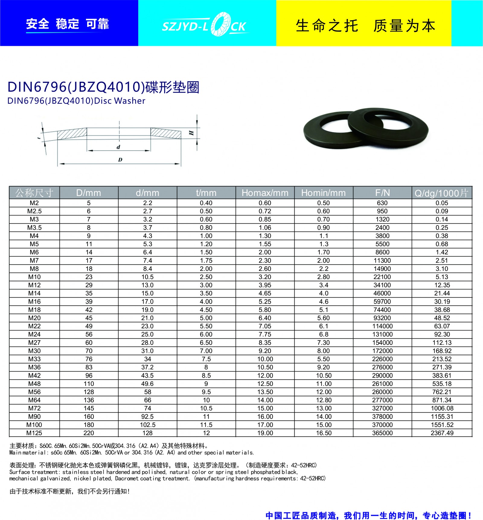 制造執(zhí)行標(biāo)準(zhǔn):符合DIN6796標(biāo)準(zhǔn)。規(guī)格:M2-M125型號(hào),也可提供訂制服務(wù)主要材質(zhì)有S60C,60Si2mn,51crav4及特殊合金材質(zhì),鹽浴硬化,表面處理為磷化黑,機(jī)械鋅,達(dá)克羅涂層等!不提供化學(xué)電鍍處理!多數(shù)情況下標(biāo)準(zhǔn)型碟形彈簧墊圈并不能完全滿(mǎn)足用戶(hù)要求,通過(guò)計(jì)算與適當(dāng)調(diào)整來(lái)獲得理想的訂制功能!